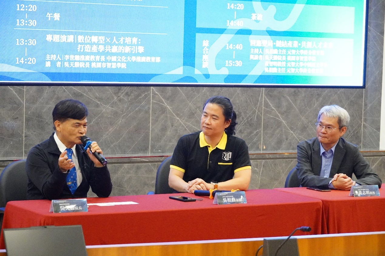 此外,元智大學邀請桃園市智慧產業學院吳天勝院長,帶領大家認識「數位轉型×人才培育:打造產學共贏的新引擎」。吳天勝院長具有豐富的產業經驗,長期協助桃園地區企業進行智慧製造與數位轉型,他從產業實務角度分享如何透過人才培育與產學合作,協助企業在全球競爭中提升競爭力。