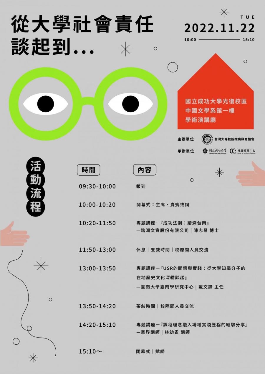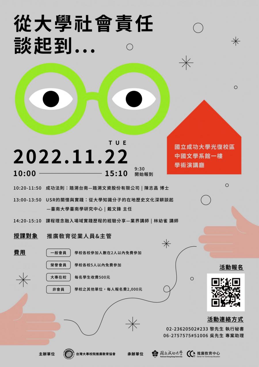活動宗旨: 台灣大專校院推廣教育協會【111年度第四季推廣教育從業人員訓練活動計畫】由國立成功大學承辦,主題為「從大學社會責任談起到…」,擬邀請大專院校推廣教育主管、全國主管機關長官、產業界領袖、及專家學者共同參與,在會中進行分享交流,以豐富推廣教育視野,並提出對於推動推廣教育邁向卓越的建言。